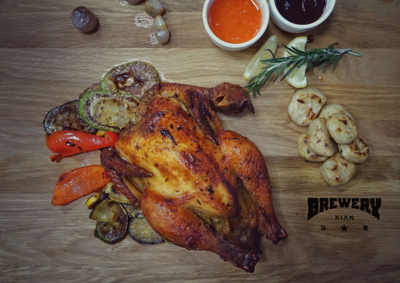 Grilled half duck on a bed of assorted vegetable stir fried in a duck sauce